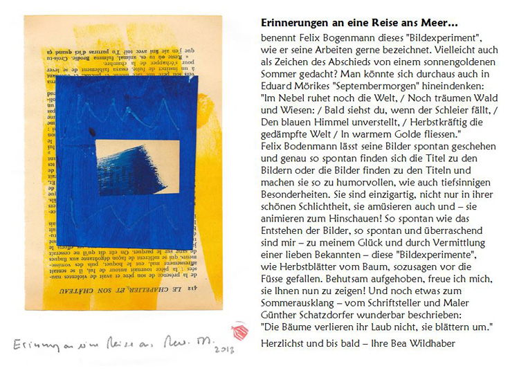 Porträit "Eine Seele, die schwärmen kann" - hier zum Nachlesen..." Die Galerie mit dem besonderen Ambiente, wechselnden Ausstellungen und einer interessanten Palette verschiedener Themen von verschiedenen Kunstschaffenden. Auch im 2024 wird Ihnen die Galerie wieder einige Künstlerinnen und Künstler vorstellen und zum Thema: "Jahreszeiten feiern und geniessen" viel Schönes zeigen können. Wir haben festgestellt, dass je nach Explorer die Seiten nicht richtig aktualisiert werden. In diesem Fall drücken Sie bitte die Taste F5.