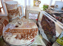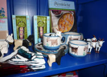 Kühe und Ziegen finden sich nicht nur sorgfältig geschnitzt im alpenländlichen "Abteil", sie schmücken auch Tassen, Krüge, Taschen und Tücher… |